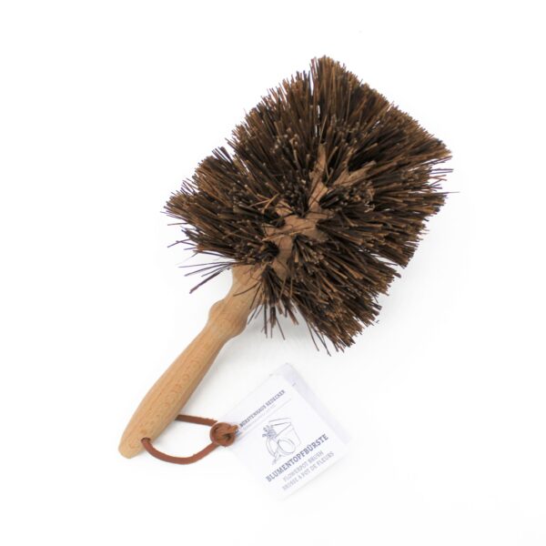 A tapered pot cleaner with durable bristles that effortlessly removes remnants of old soil from flower pots.